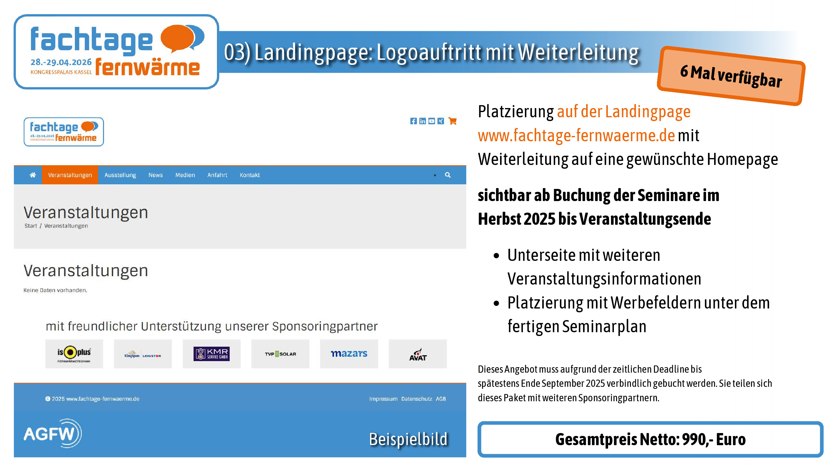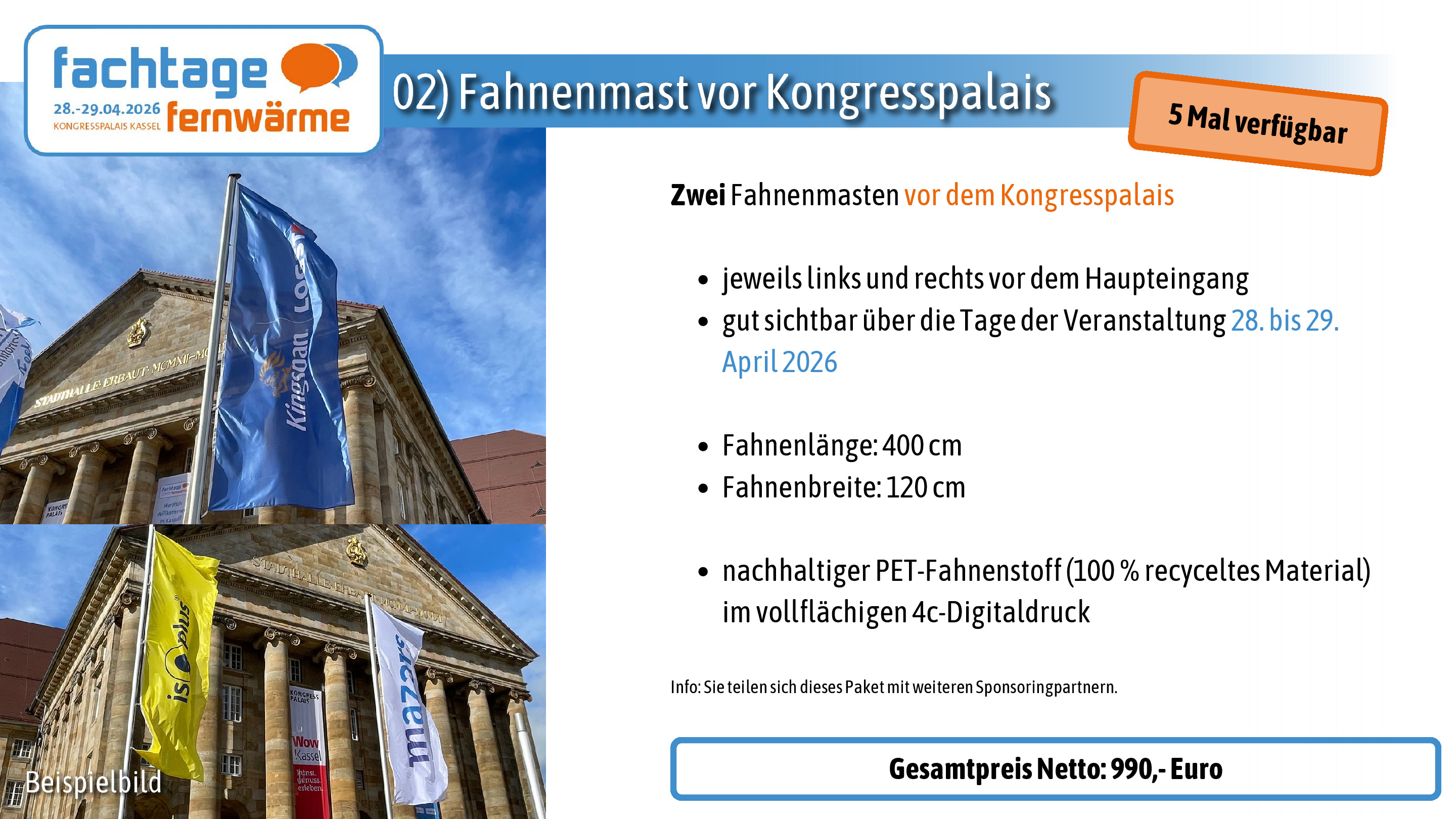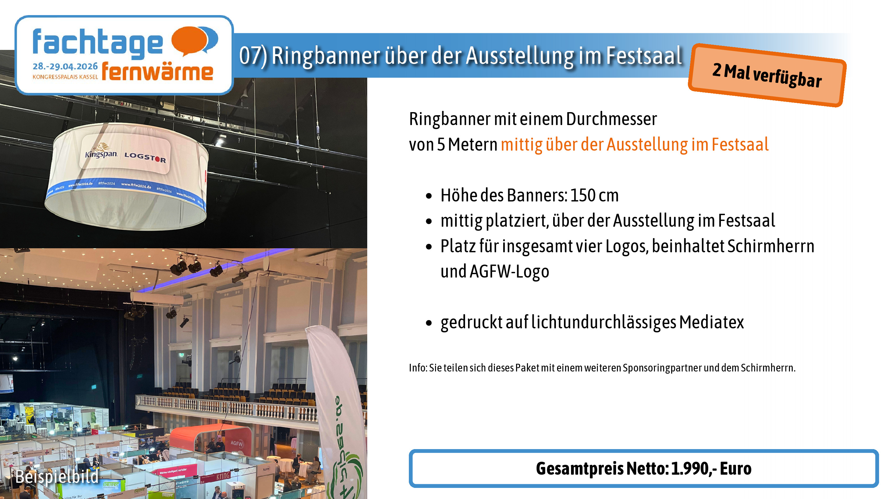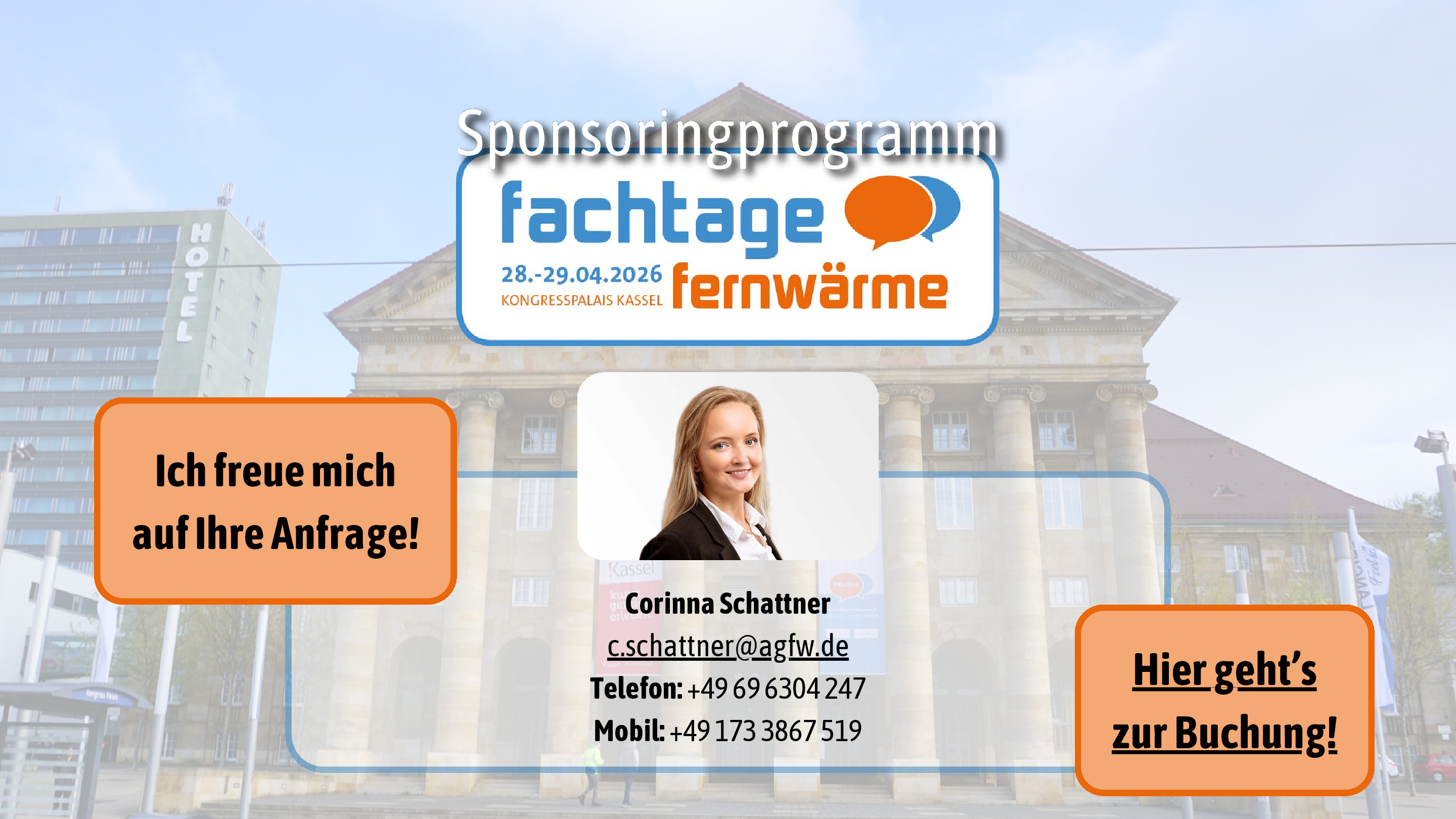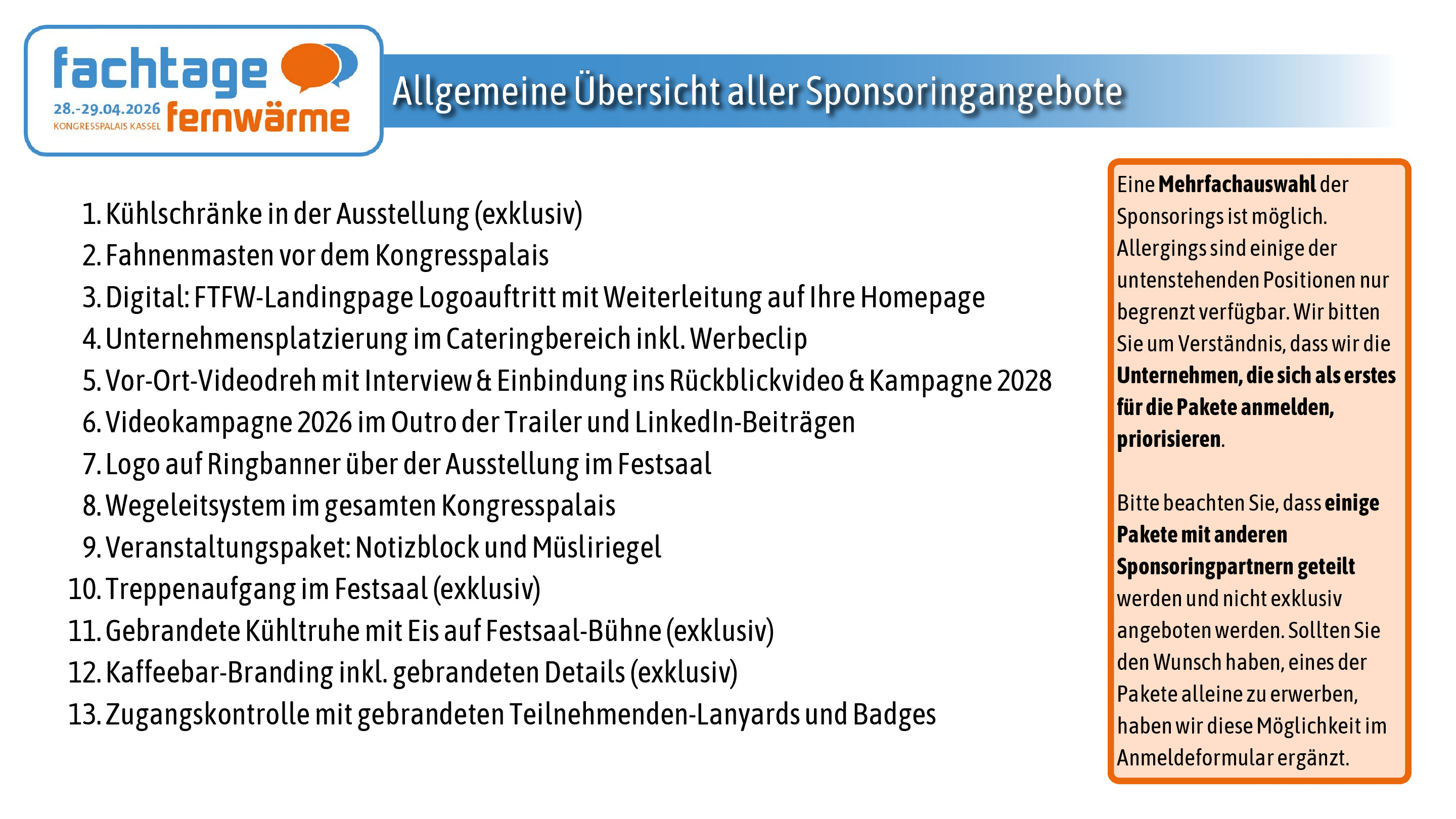 Gerne bieten wir Ihnen für die Fachtage Fernwärme in Kassel verschiedene Möglichkeiten sich zu präsentieren und sichtbar zu werden. Unsere verschiedenen Sponsorenpakete finden Sie hier.